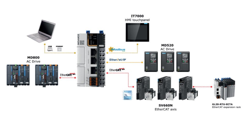 Easy series PLC controllers is designed to be optimally adapted to almost any application – from simple control of individual machines to complex control systems of technological lines. For industrial lines that require full automation, we choose a controller with advanced features, such as the Easy 500, and then expand it with additional GL20 I/O modules. Thanks to the EtherCAT communication interface, we create a distributed system with the possibility of real-time synchronization of many drive axes.