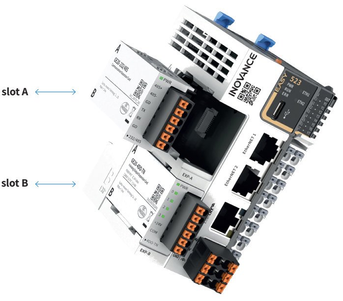 Easy302, Easy320, Easy521 controllers are equipped with 2 slots, thanks to which the controller functionality can be expanded with additional inputs/outputs and/or communication ports.