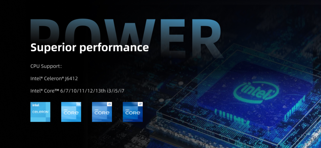• Intel® Celeron® J6412 arba Intel® Core™ i3/i5/i7 (6th–13th Gen)