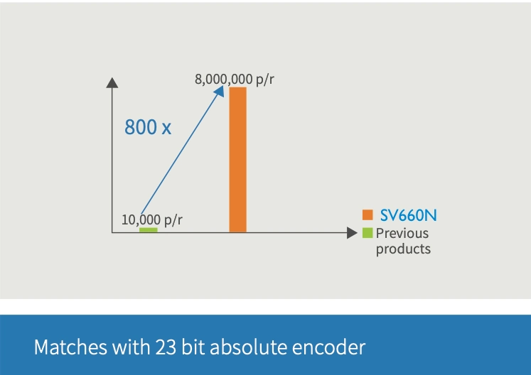 23-bit single/multi-turn absolute encoder provides 8388608 pulses (positions) for one revolution. By using a cable with a battery that maintains the speed memory, there is no need to homing the machine every time the power is turned on.
